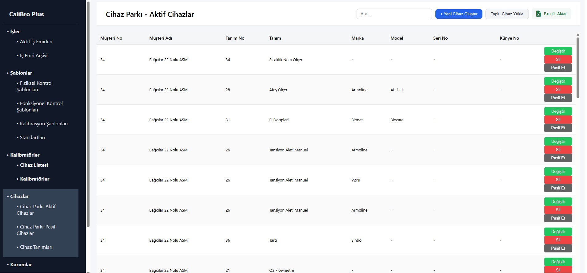 Cihaz takibi, bakım planlama ve sertifika yönetimini kolaylaştırır.